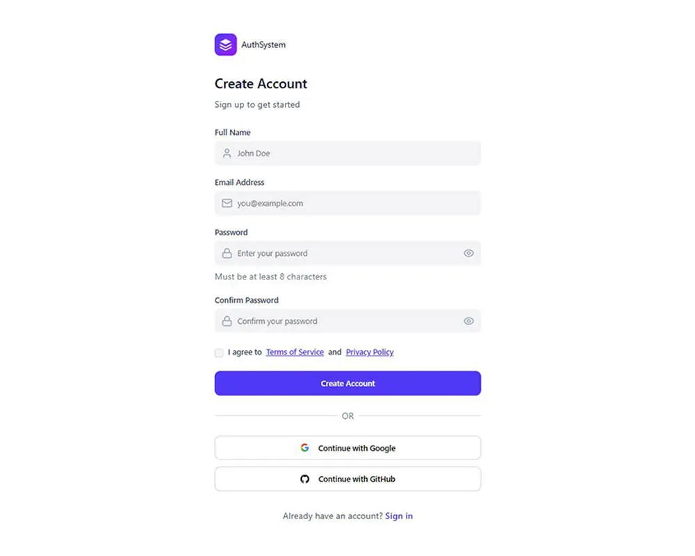 • Social Integrations: Quick login options with Google and GitHub